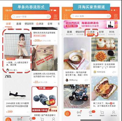 在猜你喜欢页面、微淘晒单页面、还有洋淘轻应用入口展示。