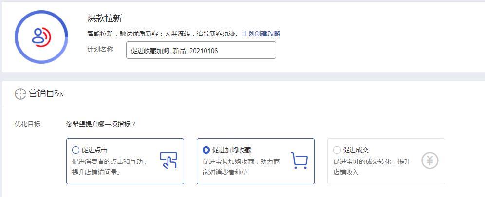② 再去建立3个不同的优化目标的爆款拉新计划,一个促进点击,一个促进收藏加购,一个促进成交。
