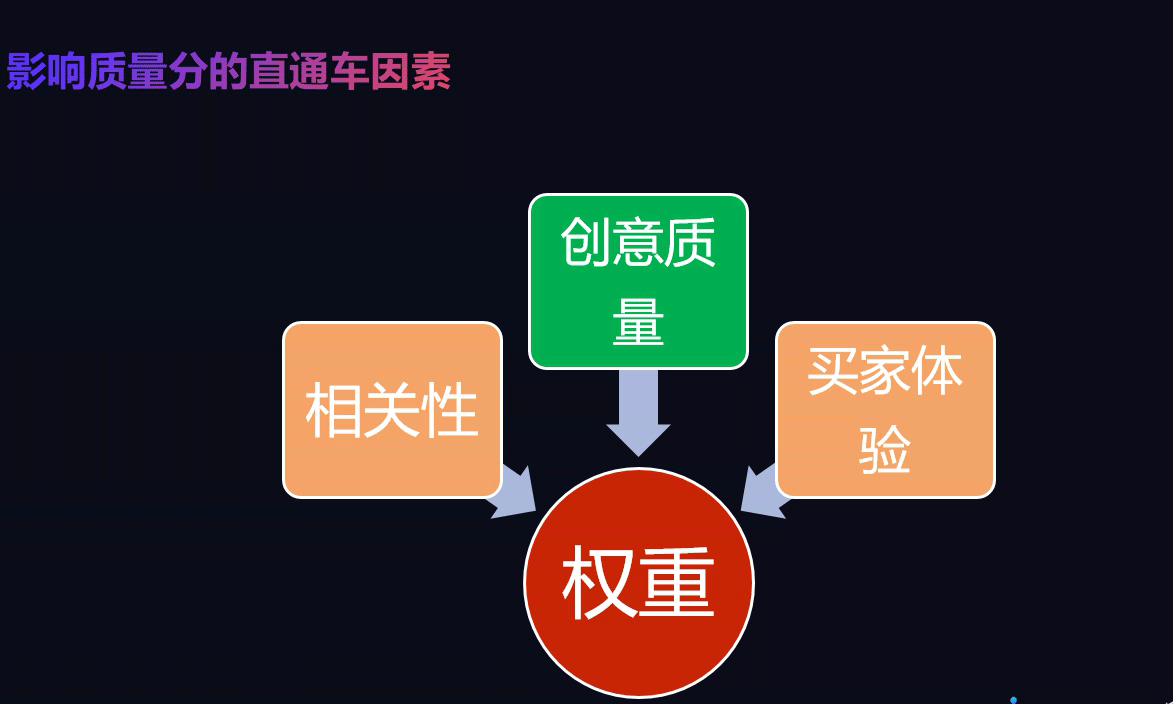 那么影响质量分的主要因素有那些呢? 如上图所示, 产品的相关性、创意质量以及买家体验,三者相辅相成公共构成10分制。