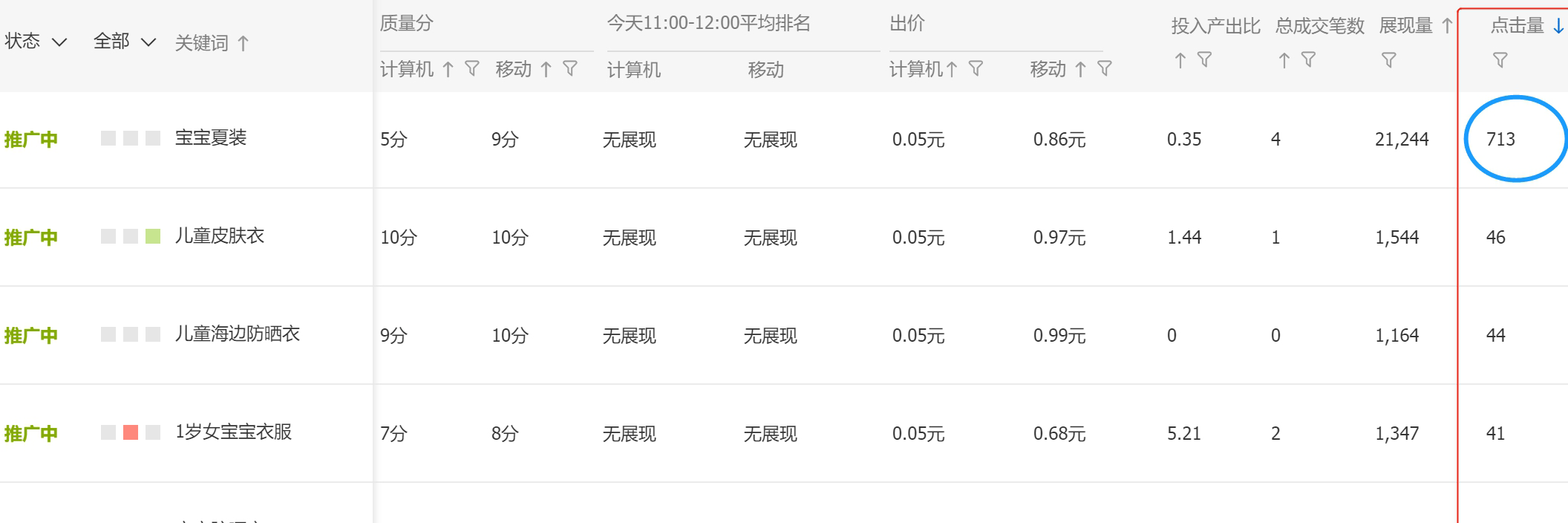 如下图,这款商品在“宝宝童装”关键词上的流量有713个,其他的关键词都只有50个以下。而且下面有几个关键词的出价比它还高,仍然拿不到足够的流量。