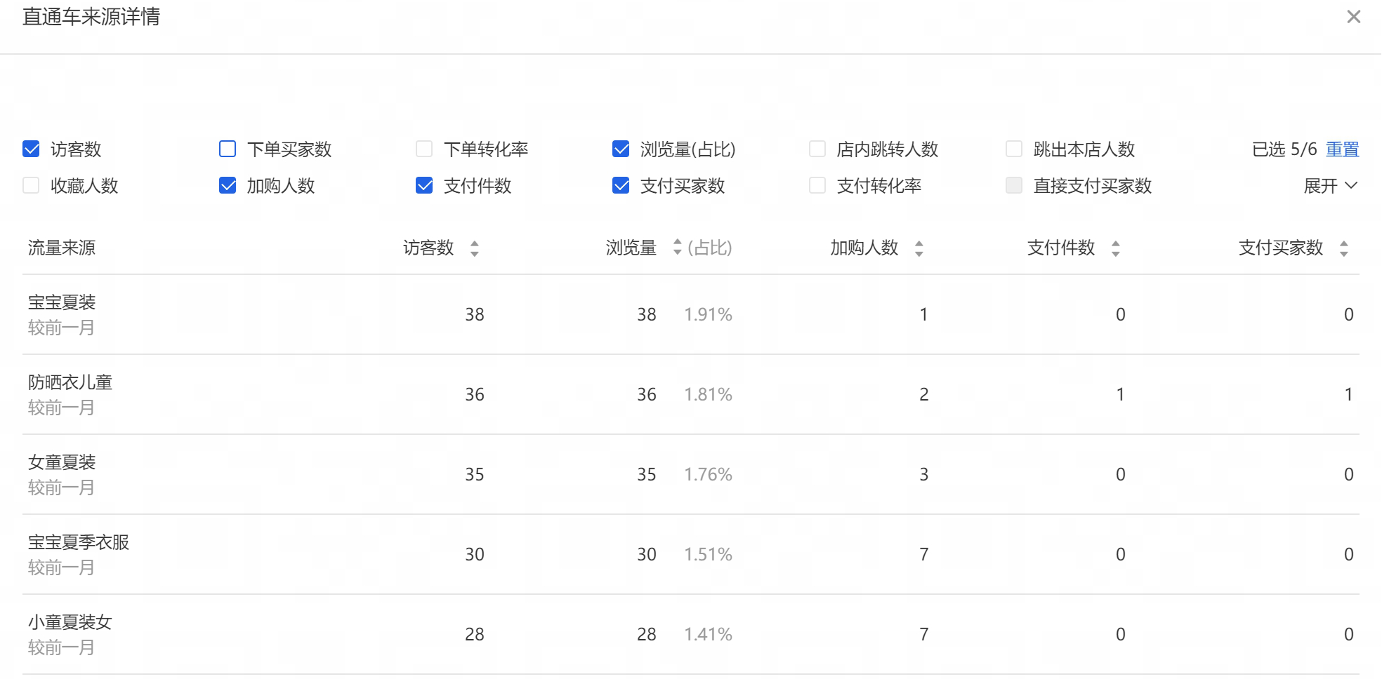 我们看到关键词都是广泛匹配,在广泛匹配的情况下,这713个流量都是通过搜索“宝贝夏装”这四个字进来的吗?我们先到生意参谋看看直通车的流量来源,可以看到这个词的流量只有38个,而类似“女童夏装”这样的词在直通车是没有投放的