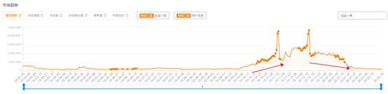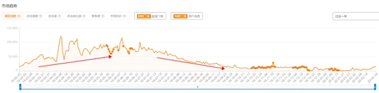 首先,从流量趋势给各位同学去分析淡旺季,以及淡旺季的布局。从下面的曲线图可以看出:展现指数(展现指数就是市场的大小)的走势,当指数上涨说明行情上涨;指数下跌说明行情下跌。很多同学就会问“在淡季应该干什么呢” ?其实我们可以找一个类目或者新卖点去做淡旺季的对冲,具体怎么干呢,别急!马上就告诉大家一个小技巧,帮助同学们快速正确的找到对冲淡旺季的类目卖点。