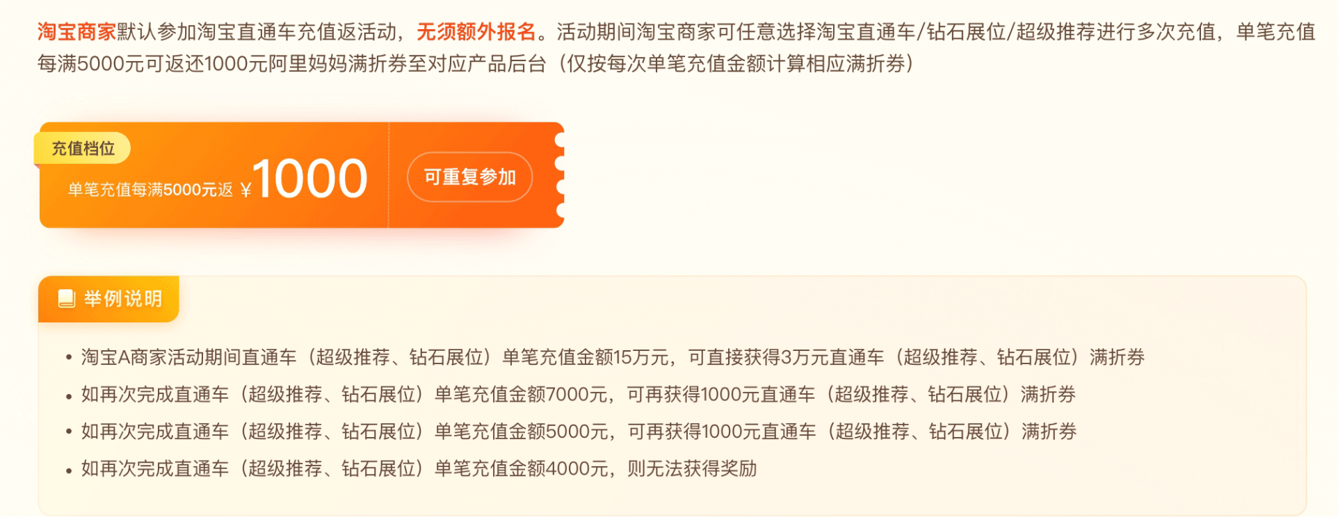 2玩法一仅适用直通车,仅限首充返;而玩法二适用直通车、钻展、超级推荐,只要是5000的倍数充值,可以重复参加返款;