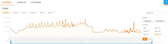 第一大功能:市场趋势功能。主要关注点为关键词周期性趋势变化,从这个趋势变化中去判断现在当下市场的走向。如图,展示指数的曲线图,这个图很好的说明了淡旺季的一个分布情况,曲线往上就是旺季的开始,曲线往下就是旺季的结束,通过这样的判断我们就可以提前布局淡旺季了。