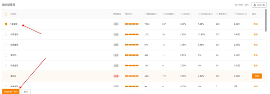 第二大功能:相关词推荐。在我们刚开始做一个行业,不懂行业关键词的关联情况下,可以通过这个相关词推荐,去了解行业关键词的相关性。如图所示,可以直接通过点击关键旁边的小方块,选择直接添加到推广计划里面。布局前期用来选择关键词是非常好用的。