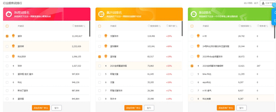 第三大功能:市场排行分析。这个功能主要是通过三个榜单,热搜词排名榜单,了解什么关键词是当下的热搜;飙升榜单,了解上涨最快的关键词;新词榜单,了解现在新出的关键词。通过这三个榜单,可以帮助我们快速了解当下市场什么关键词最热,有哪些新词。我们通过榜单就可以选择相关性高的词,以此直接加到我们的推广单元。