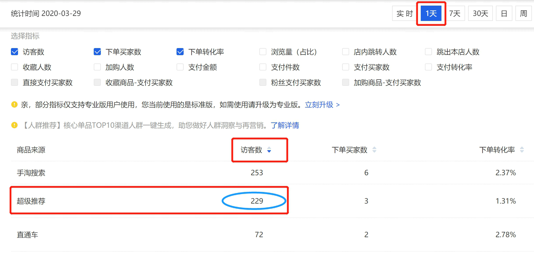 很明显地对比,生意参谋里面这款商品的超级推荐访客有229个,而超级推荐这款商品的点击量是257个,确实超级推荐后台的数据要高于生意参谋,这是为什么呢?