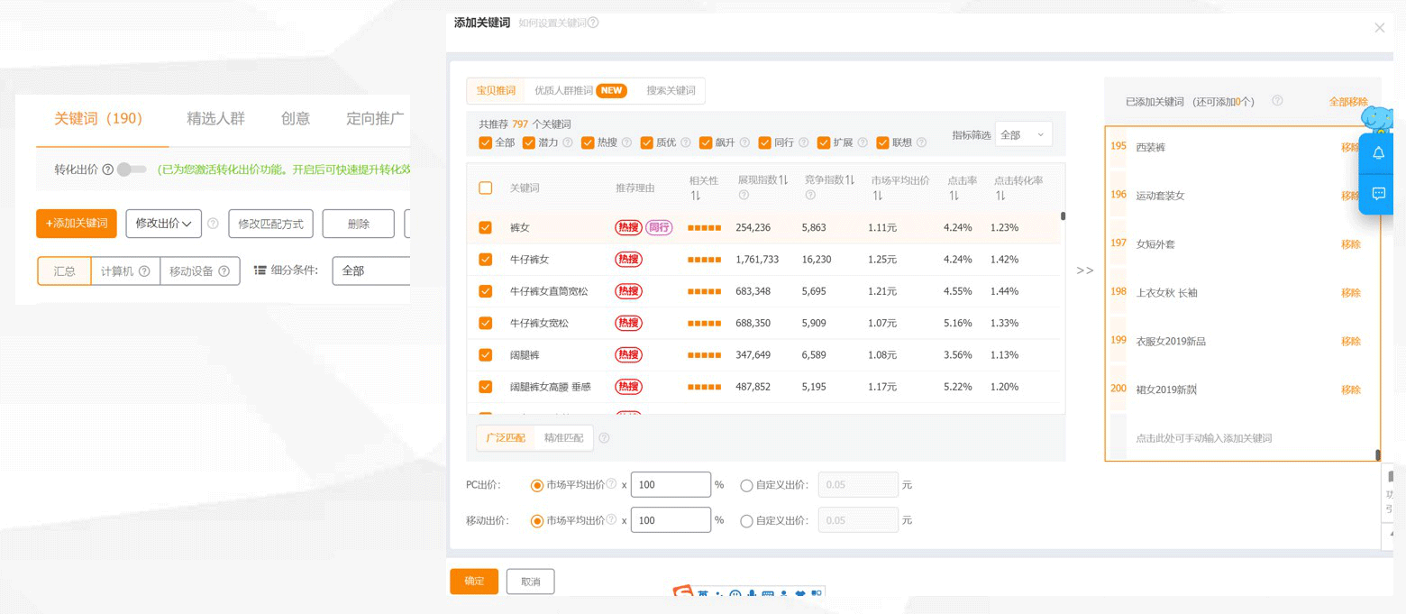 这里是大家最熟悉的地方。给推广的款式添加关键词时,系统自动会提供最多800个推荐词。通常以大词为主,右边的数据指标列明了词跟款式的关系。这些并不都是好词,需要我们做挑选。可以根据词义,以及相关性的判断,优先选出对款式有效的。