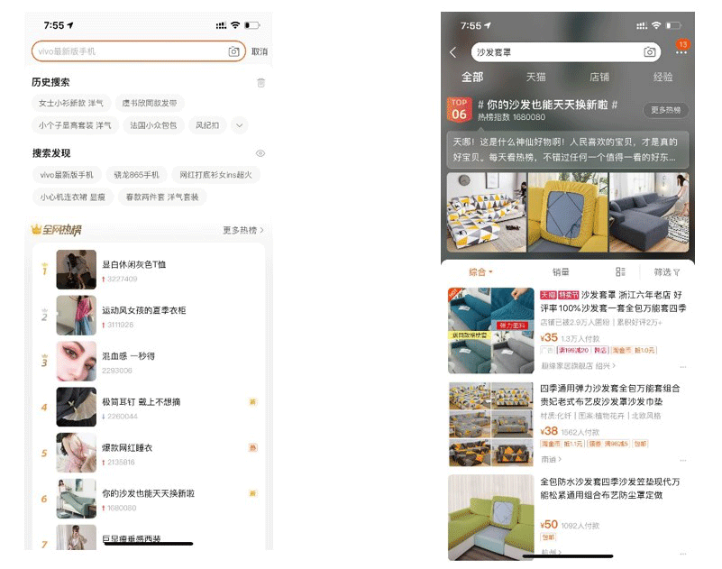 其中有以往的搜索记录,也有根据客户喜好,推荐的一些搜索词。下面还有个全网热榜,这个是对各个用户都统一的搜索结果,列的是最近的淘宝最热搜的主题。点进去后,又会是另一些词的搜索结果。