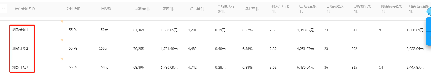 比如我这次要测试30个新款,我会把这30个款同时放进3个测款计划,每个计划都是放同样的产品。因为多计划测图最后看每张图片在多计划中的综合数据会更加精准。