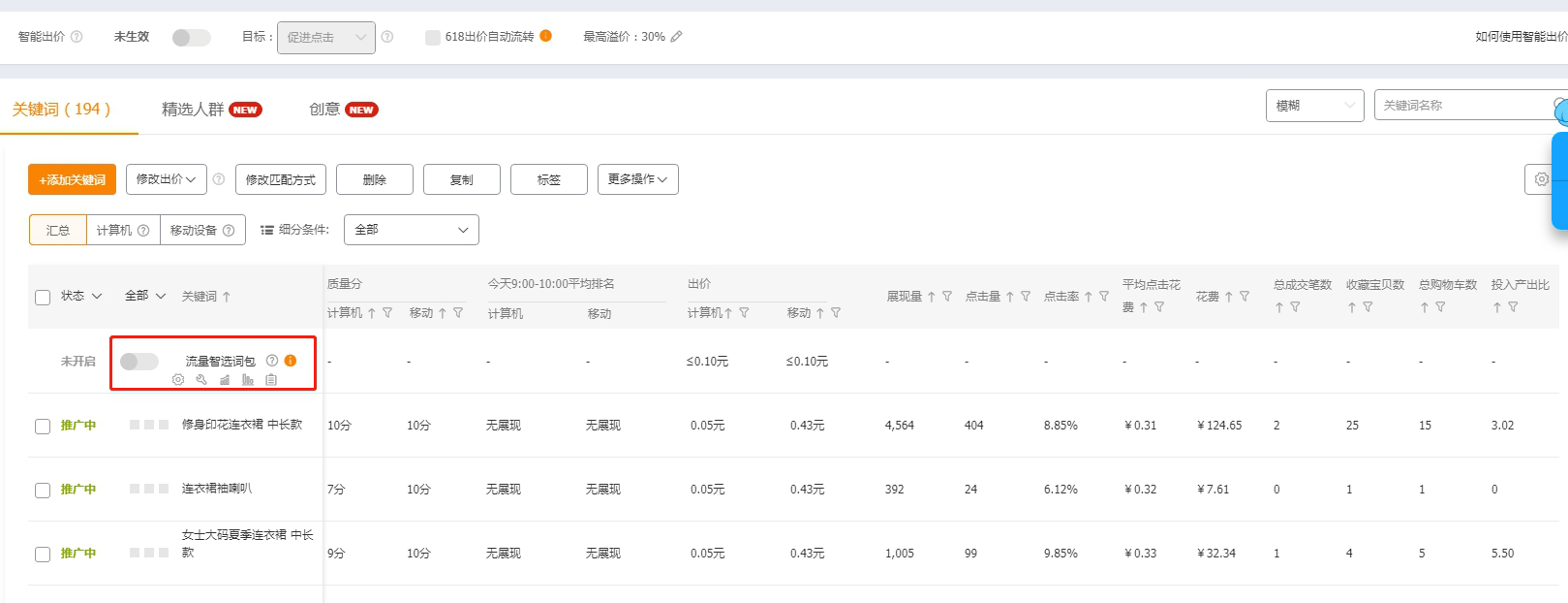 3、流量智选:流量智选包是淘宝跟进你的产品属性给产品进行关键词匹配的,而我们前期不知道会匹配什么词,所以流量智选包在测图期间选择关闭。