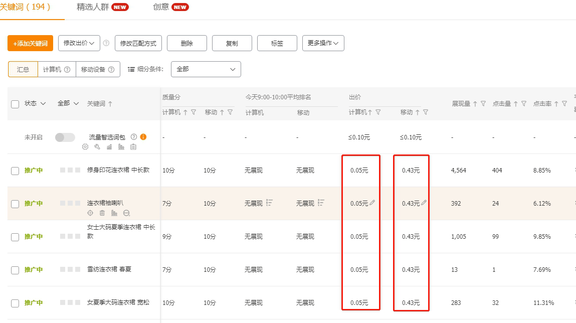 4、关键词出价:我在推广的过程中是花钱买展现,但后台可以出价的展现渠道分为PC和移动端,而我们大部分的成交都在无线端,这时为了不混淆无线端数据就要把PC端出最低出价。