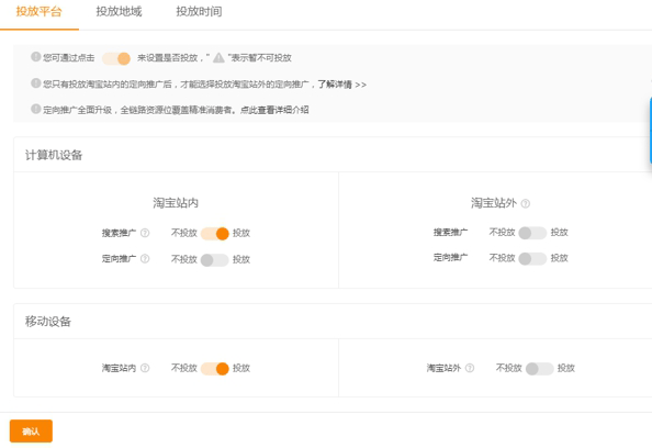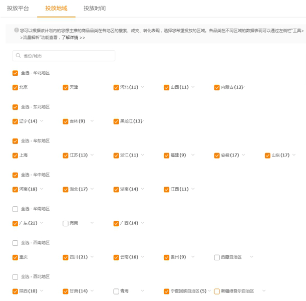 地域:一般默认:除去,西藏,新疆,内蒙古,海南,其他都投放。为什么这么设置呢?考虑到这几个地方邮费相对比较贵,所以一般我会关闭,但是在实际操作过程中大家要根据自己的类目实际请款过来操作。有些类目的客户就是这几个地方的占比大,那肯定要打开的哈。
