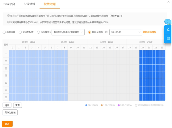 时段如何设置呢,这个是要重点说下的事情。很多新手商家朋友对时段设置不知道如何操作。正常我们这边是三段式0点到8点30%、9点到20点100%、21点到24点90%。后期优化的时候每次是10%进行溢价调整,如果调整了10%发现又没有流量了那在加回来。