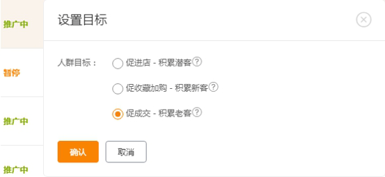 产品测款测图阶段,因为我的目标是需要流量,所以选:促进店;;产品测出来了,可以选促进收藏加购。产品衰落期,设置:促成交;