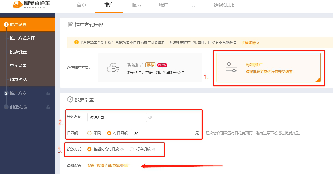 第三步设置投放方式,这两个投放方式的区别是,智能投放会相对匀速花完你日限额,标准投放是最快速度花完。这里因人而异了,我个人喜欢用智能(如图标识3.)