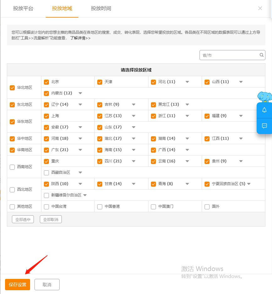 地域设置只要你能发货的地方都点开,不需要去特意精准地域。地域优化后期的时候再做操作,前期先引流。这里注意一个细节,记得点--保存设置。