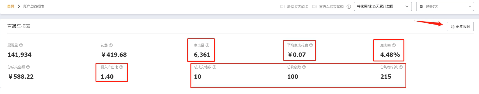 画框的都是重点数据,没画框的大家去看后面的问号理解下就行,下面我们一个个讲:点击量:这个指标大家可以理解为,直通车为店铺带来的流量,就是访客数。千万不要把流量和展现量理解成一个东西,那是错误的。