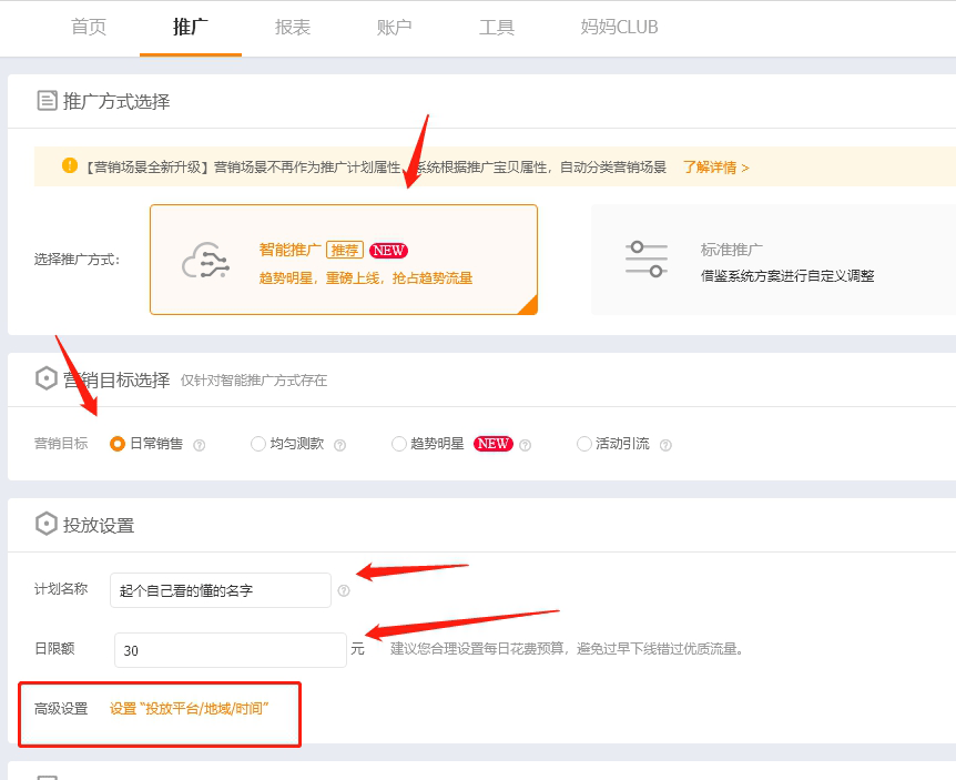 我们进入下图,注意箭头地方的选择和设置,这里主要说下营销目标,营销目标分,日常销售,均匀测款,趋势明星,活动引流。后面的问号都有介绍,大家可以自己看下,这里我就不讲了。