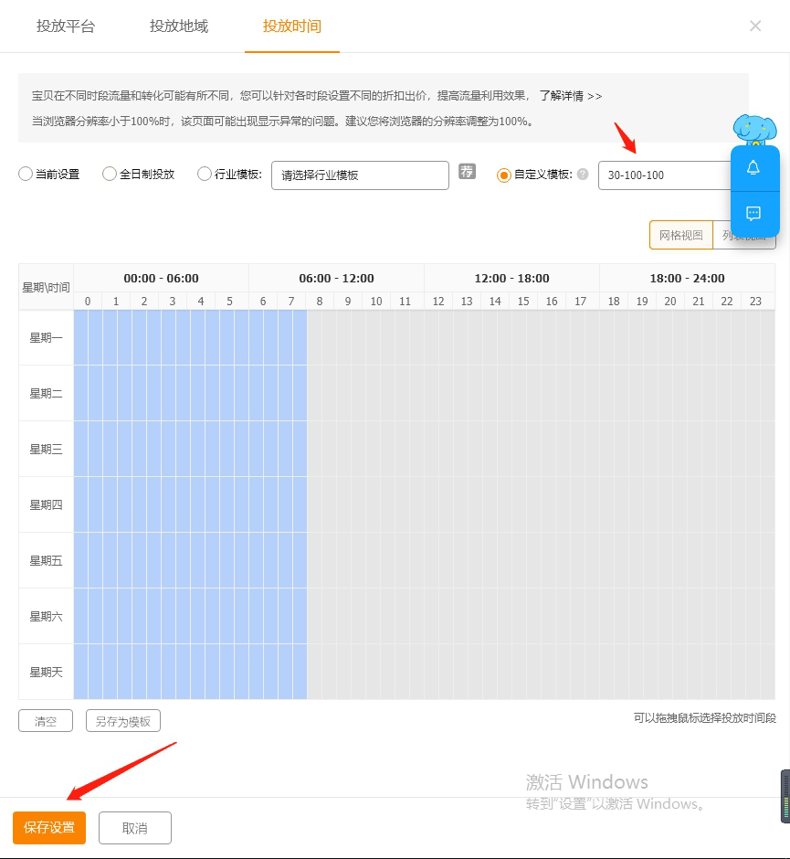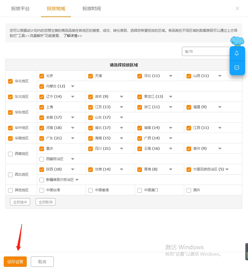 设置完记得点保存设置,高级设置里的投放平台,地域,分时折扣,基本就完成了。