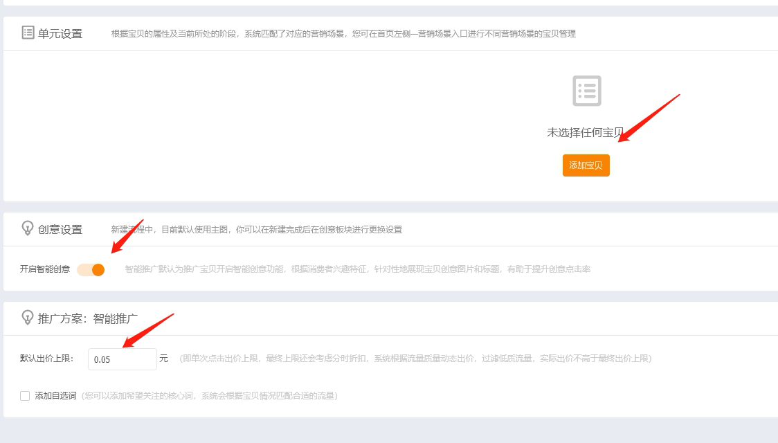 我们开始下面的设置,在添加宝贝之前,说下智能创意。大家对自己的产品主图的点击率不知道或者没有自信,建议开。自己主图点击率如果非常高,可以不开。