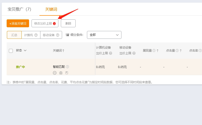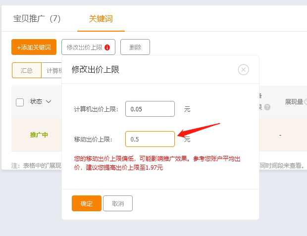 默认出价上限,0.05元就是最低,为什么这么开呢?因为这个设置是计算机端和移动端一起设置的。