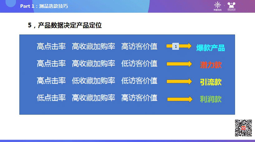 毛利率足够高决定了我们推广支出的力度,产品无硬伤决定了我们产品的生命周期。爆款产品总是可遇而不可求,如果没有没有爆款如何处理呢?我们要选择哪些产品做主推呢?首先我们先对产品做定位,如下图: