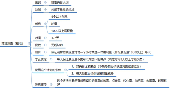 如图所示,精测阶段选词一定是精准类目大词,只有精准的词才能匹配出精准的图片,不能发货的地域必须关闭后再测试。筛选出至少四个优秀的创意轮播,保证1,000/天以上的展现量测试3-7天,根据图片的展现和自己的预算来定。注意这时段内,每天的展现一定不能少,到时间再换图,每次换图一定要做好登记,方便进入第三阶段时使用。进入第三个阶段的图片一般2张左右就足够了。指标对比一定是点击率、转化率、加购率与收藏率结合做综合对比,展现量必须在相同或接近的情况下进行对比,得到的数据才具有参考性。