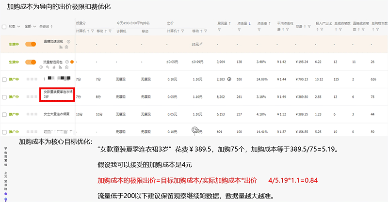 也就是说我把关键词的出价从1.1元压到0.84元如果还可以做到一定流量,那这时买进来的流量就有机会做到4元的加购成本。但是点击量如果低于200建议保留观察继续跑数据,数据量越大越准。
