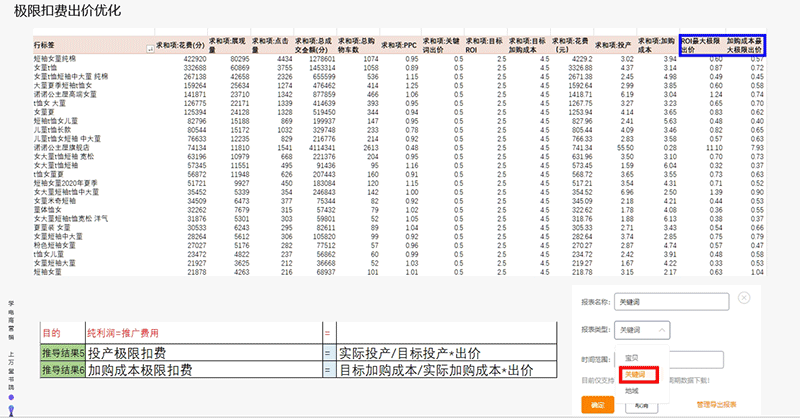 表格中的关键词出价,目标ROI,目标加购成本,和两个我圈蓝色框的极限出价是需要插入字段和计算字段的。但是这个就要求对数据透视表的熟练使用了。不会透视表的同学可以去百度一下使用方法。