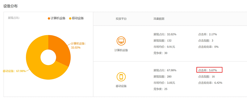 这里我们看的是移动设备的流量解析,可以看到点击率为5.67%,
