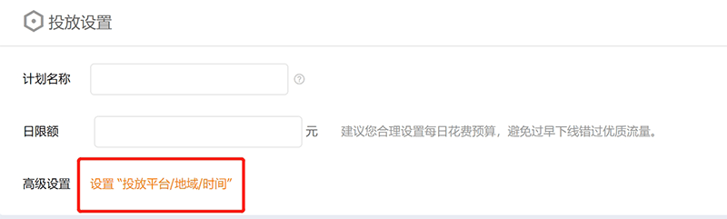 下面点击“高级设置”,会弹出个窗口,分别是“投放平台”、“投放地域”、“投放时间”。
