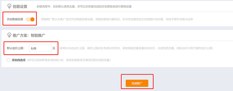其次,在推广方案里,填写出价上限,通常就是我们行业点击单价的三分之二就行,后期根据获取流量的多少再细微调控,做好这些后,就点击完成推广,这样,我们的“智能计划”就建立成功了。