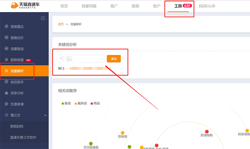 首先,我们打开直通车,在最上方的导航栏处找到“工具”一栏,然后点击“流量解析”,进入下面的页面