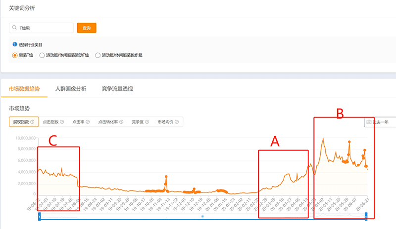 这样,我们就得到了一个关于“T恤男”这个行业的整体趋势图,从这个趋势图不难分析出来,如果我们要做这个行业的话,从2月底之前就需要开始备货,3月初到4月底,这两个月是整个行业冲量的最好时间段,高峰期是5月初到6月底,这两个月达到全年最高峰。