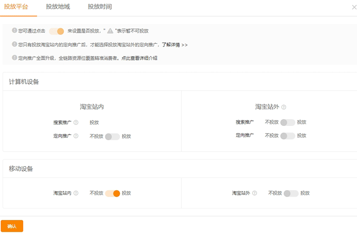 1.投放平台的设置:只投放站内无线端,因为现在90%以上的流量都来源于无线端,再加上PC端的点击率太低,所以我们测款时只投无线端就可以的(PC端是默认投放的,PC端不投放需要后面关键词出价PC端统一出0.05元)。