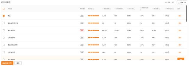 在接下来的就是相关词推荐了,这下面的关键词都是基于搜索的关键词给你推荐的,同时也可以进行关键词下载。