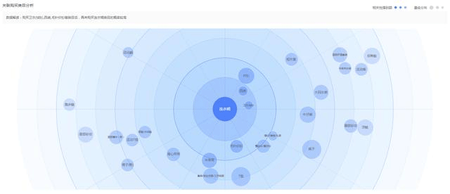 这里主要是做关联销售的,我们可以看到颜色越深,表明和我们的关键词相关性越高,圈越大表明他的一个搜索人群越多,可以作为关联销售的一个参考。