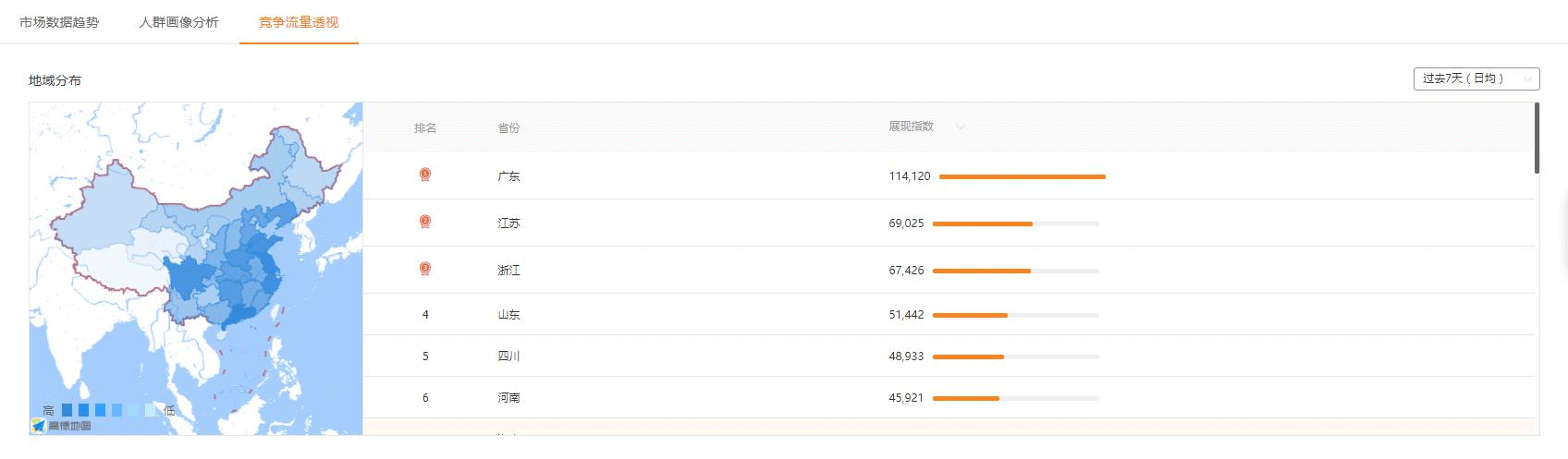 首先,我们可以看到的是地域分布,我们可以根据颜色的深浅情况来判断不同省份的展现指数情况,也可以直接看排名。