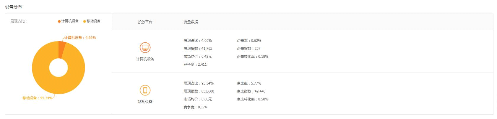 可以看到的是我们的关键词的投放平台分布的流量情况,可以看到主要的流量来源都是淘宝的站内流量,所以主要的投放平台就是投放在站内的,然后就是我们的可以看到这个产品在PC端和移动端的一个展现占比、点击转化率等相关数据。