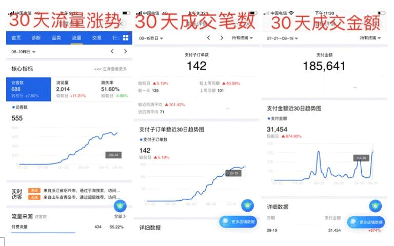 虽然这款单品的利润很少,但是有效的带动了店铺的流量和后台的点击转化数据,撬动了免费搜索流量,小单带动团购大单,相关链接引流到店铺其他高客单价宝贝,带动其他产品的销售,第一个月销售额突破20万元,把这个天猫的沉睡半年的天猫彻底搞火了。