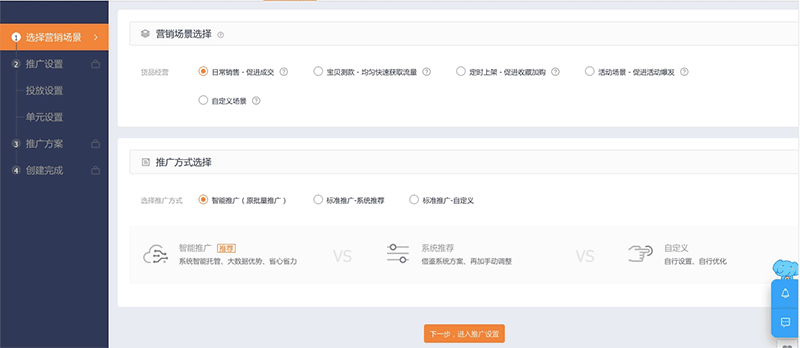 智能推广新建操作流程非常简洁,简单三步即可完成推广计划的设置。