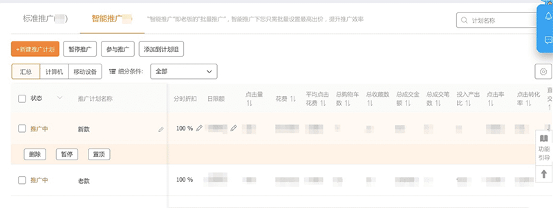 A、计划列表:目前支持最多创建20个智能推广计划,并且智能推广计划可以删除:
