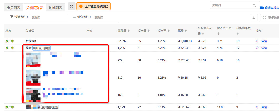 b、如果您对部分关键词不满意,可以在此删除屏蔽改关键词,后续的系统智能匹配将过滤该关键词流量。