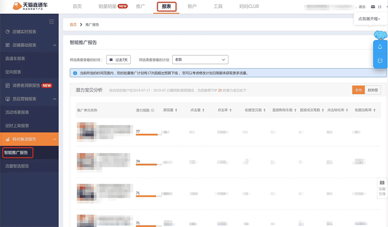 根据智能推广数据针对性提供了智能推广报告,让掌柜们可以快速准确地进行潜力宝贝的甄选、优质关键词的提取,并且提供了一键迁移至标准计划的功能,轻松实现从智能推广核心宝贝到标准计划重点投放的无缝衔接。