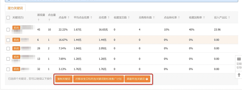 a、精选出智能推广阶段综合表现突出的关键词数据(包括系统智能匹配关键词和掌柜自选关键词),方便掌柜重点调整优化。并且提供复制关键词和迁移关键词到标准计划的选项,一步将优质关键词迁移至标准计划中。