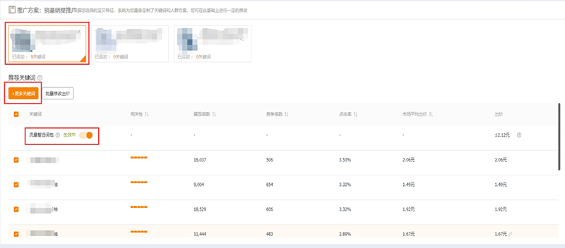 b、开启流量智选词包的同时再自定义添加关键词(也可不开智选词包,全部使用自定义添加关键词),对于操作能力不是特别强的卖家而言建议打开流量智选词包(对流量有一定保障)。