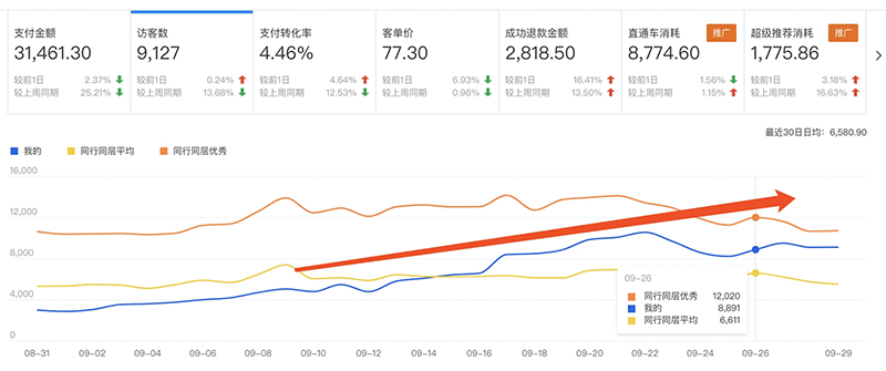 我们在9月初的时候,一天的直通车总流量差不多在1000左右,在后半个月提升来做增幅,在后半月的时候流量提升到4000左右,随着流量提升上去,我们的加购数也随之上升了,为我们后面推款奠定了基础。