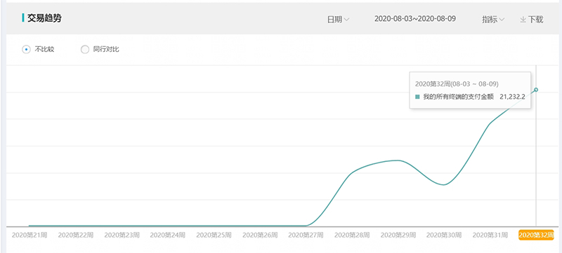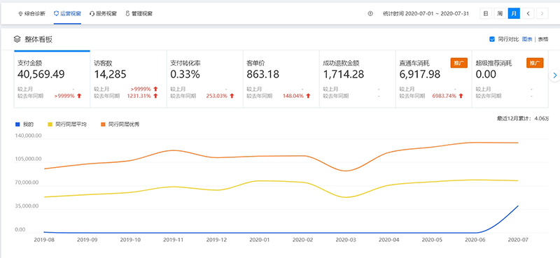 从上面图表中可以清晰的看到,在(8月3日-8月9日)这一周里,7天的支付金额已经达到21232元。并且7月份的店铺整体运营情况如下:
